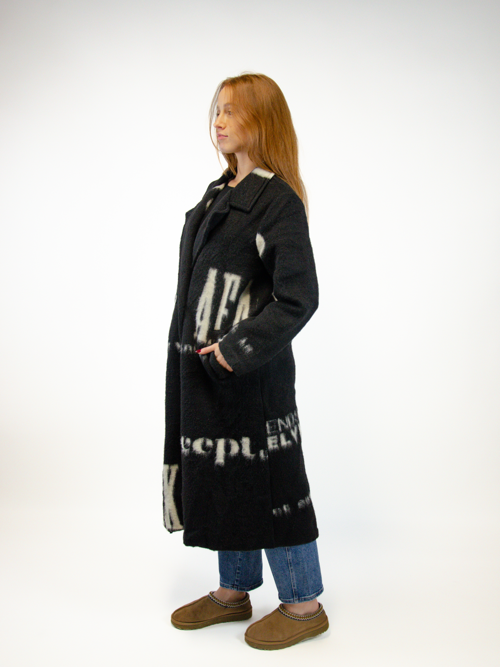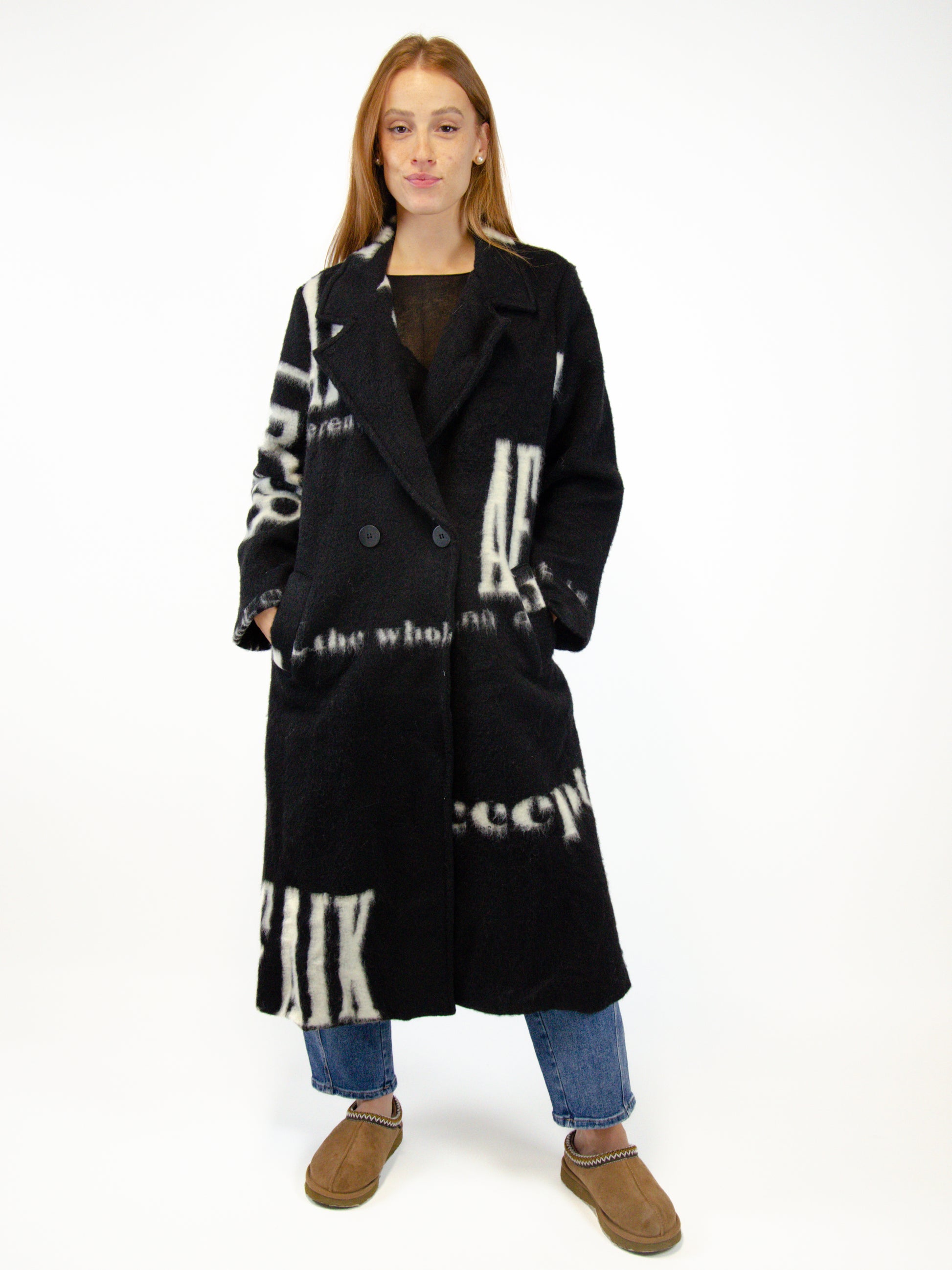 Maxi cappotto lungo doppio petto, collo a camicia in tessuto lanoso con stampe a motivo “LETTERE” e due tasche laterali.